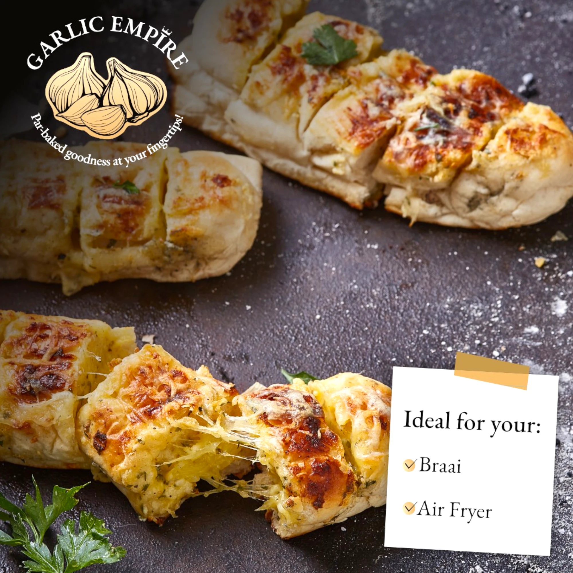 • This Par-Baked Garlic Bread is no ordinary bread. It’s a canvas of rich, golden crust, painted with the most aromatic garlic, herbs, and the finest cheese. Produced by Garlic Empire